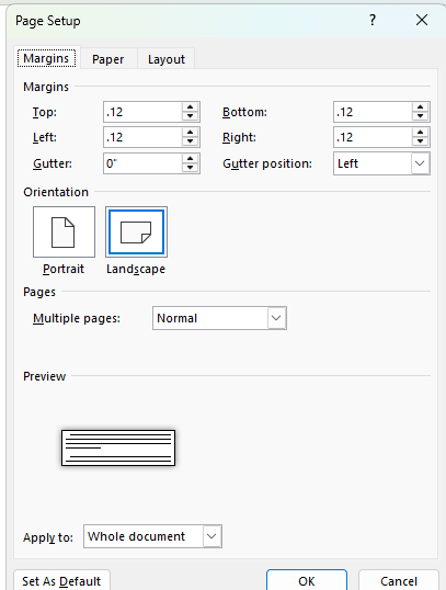 On the Paper tab, select custom size and enter the width and height measurements of your label (most common is 1 1/8 by 3 1/2)