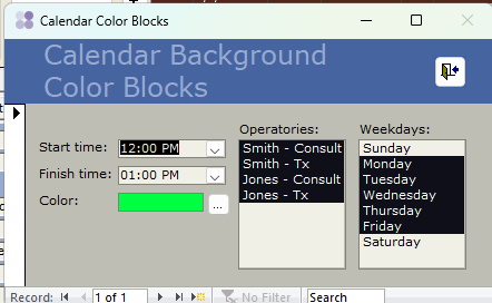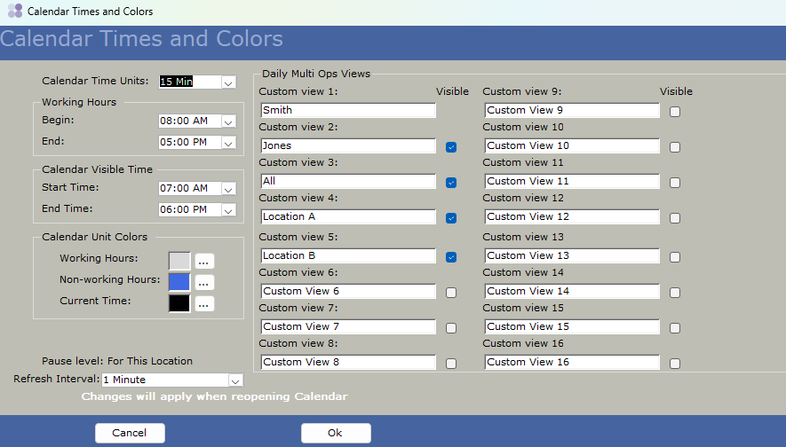 This is where the earliest and latest working times are set, visible time to extend the calendar as desired (I usually do 30-1 hour prior and 1 hour post). This is also where the names of the tabs that show across the top are designated.