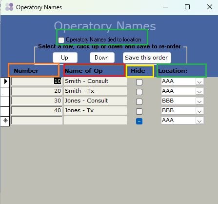 This is where all of the operatory columns are named, the order can be changed, and a currently unused column can be hidden (they should not be deleted or overwritten since there is history in those columns). Columns can be tied to a location (so they can't make an appointment for Location A in a Location B operatory column) by checking the box at the top and selecting the appropriate location in the drop down for that column.