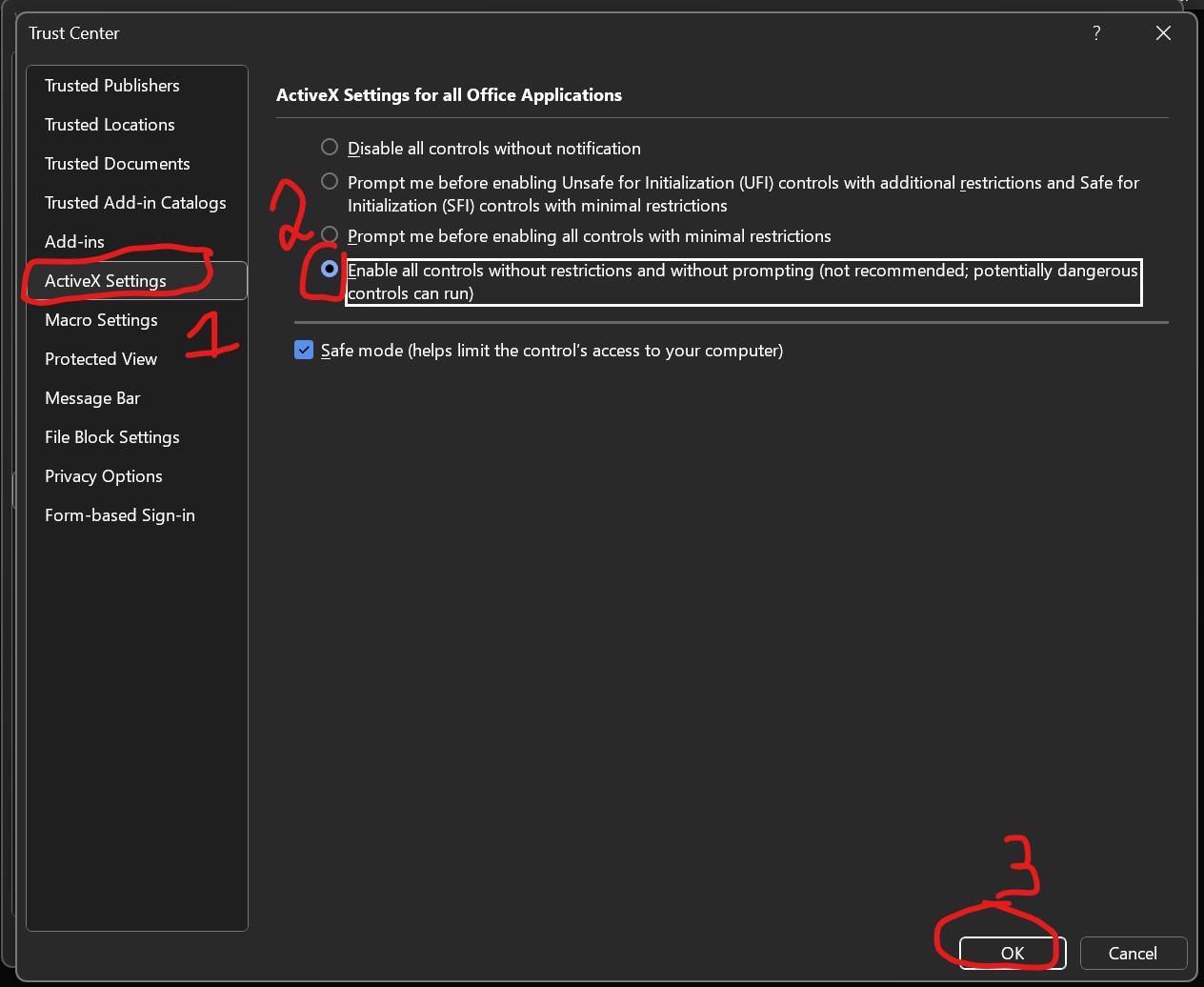 Microsoft Office Trust Center Settings (OLEServer, ActiveX, Letters, Calendar, Reports)