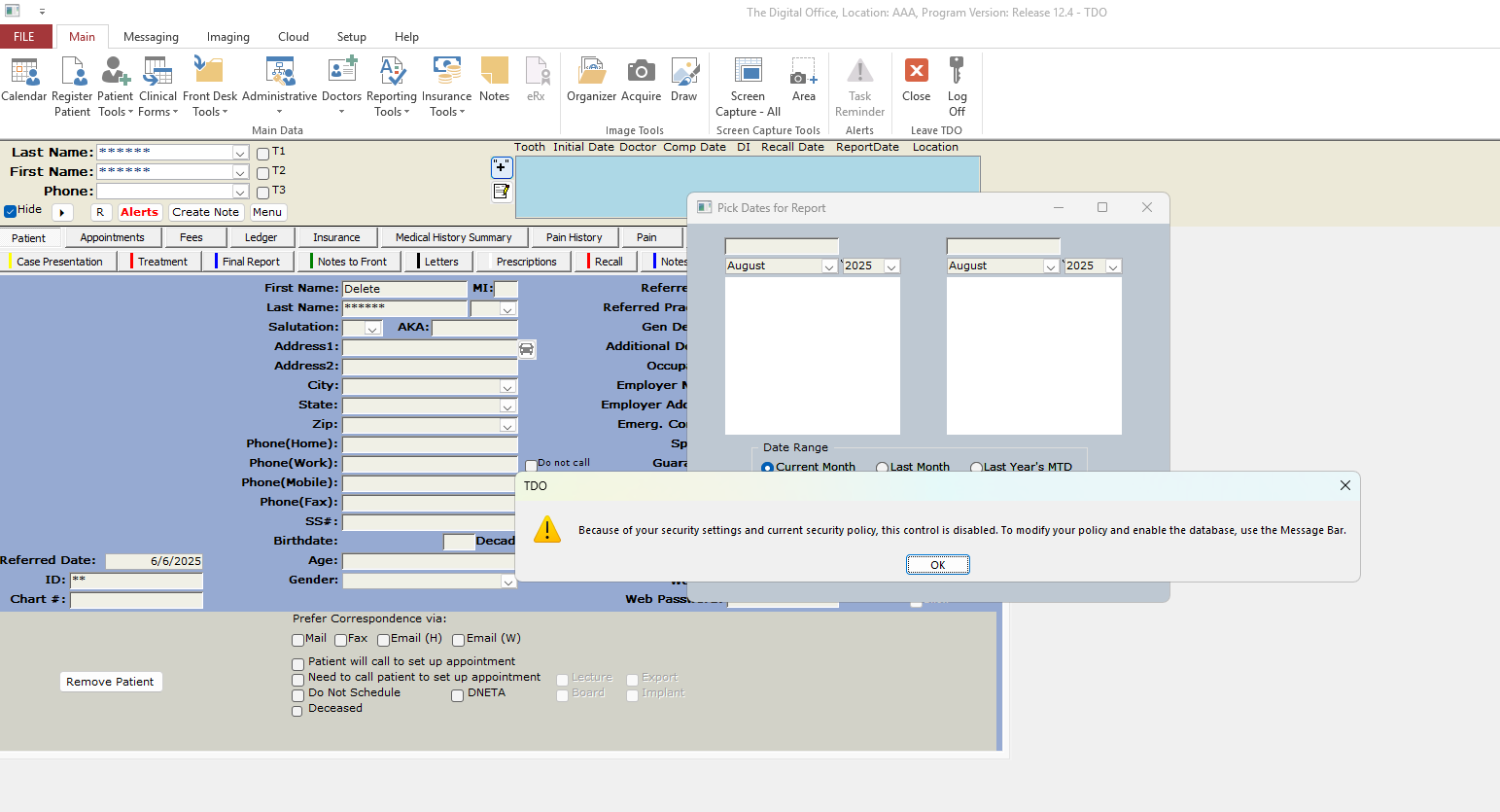The issue can also present when attempting to run certain reports. "Because of your security settings and current security policy, this control is disabled. To modify your policy and enable the database, use the Message Bar."