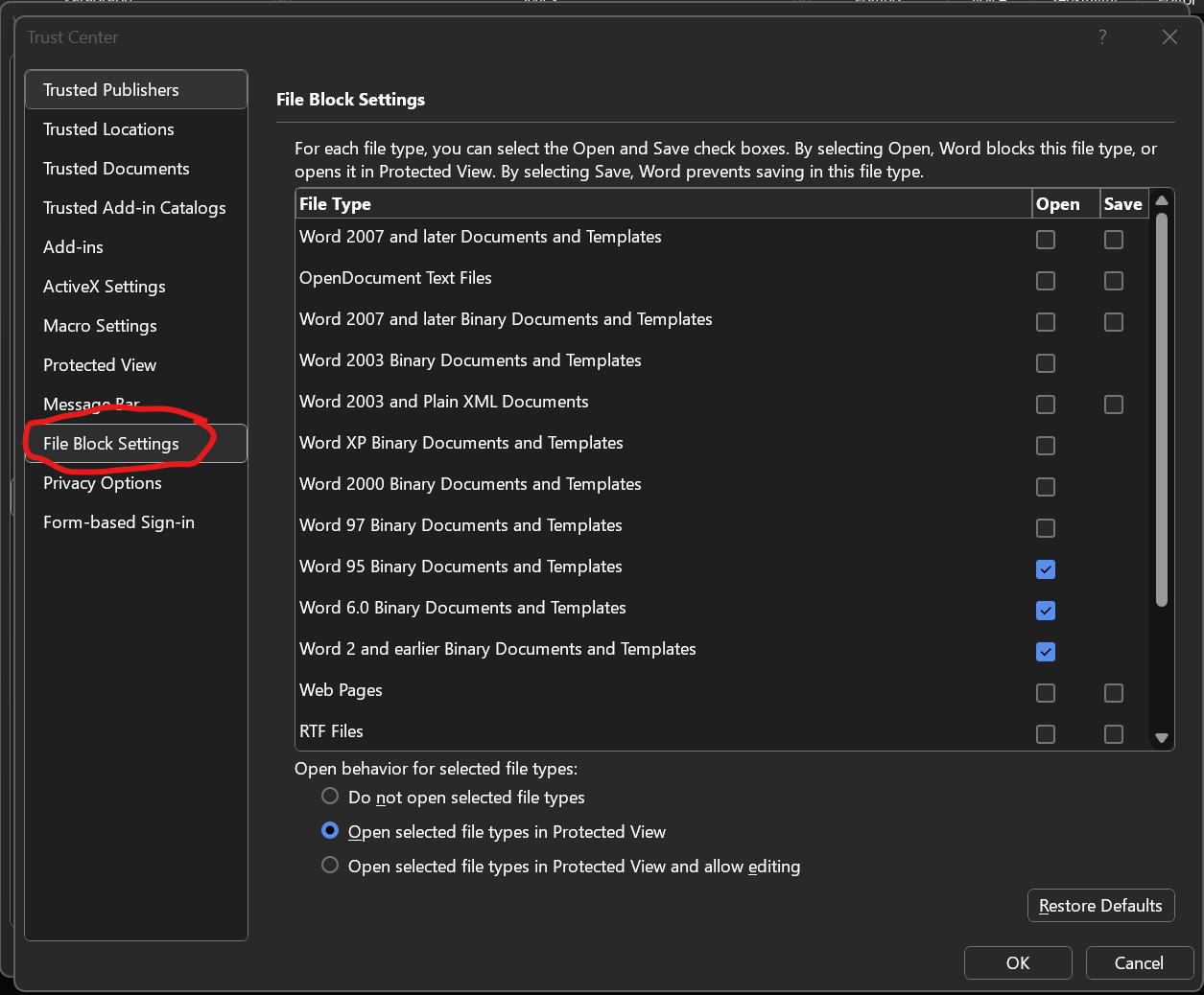 5) Click 'File Block Settings' and then ensure at least Word 2007 and later Documents and templates are unchecked. (TDO recommends utilizing the 'Restore Defaults' button)