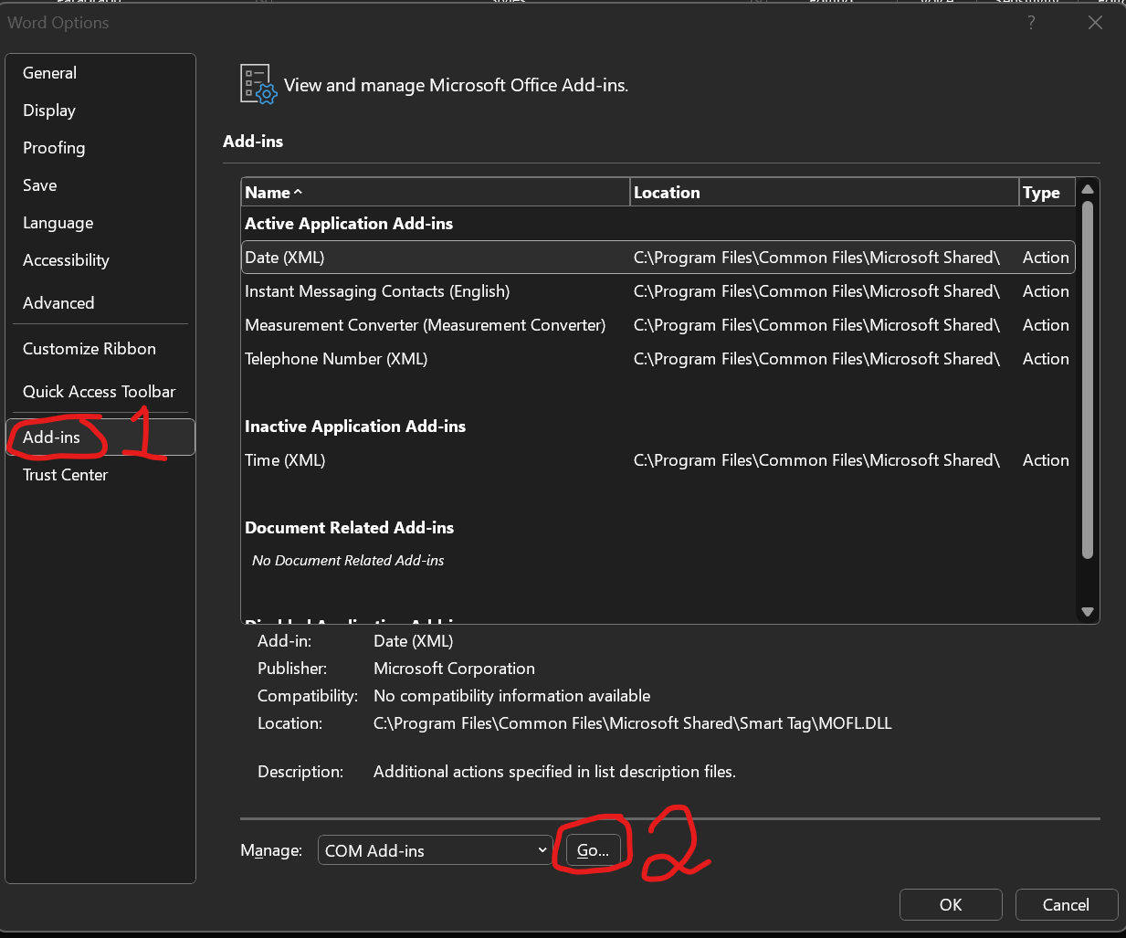 TDO recommends that all COM Add-Ins be removed from Microsoft Word.