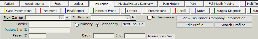 You have the option of selecting insurance by carriers or by profiles. Most offices prefer to use just the carrier list. Profiles simply allow you to store employers, group numbers and benefit information together for different insurance companies.