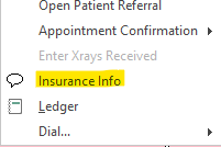 This can also be accessed directly from the calendar by right clicking on a patient’s appointment and selecting Insurance Info.