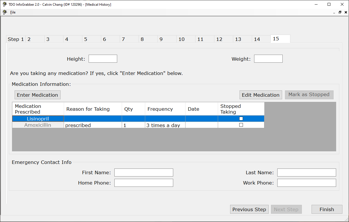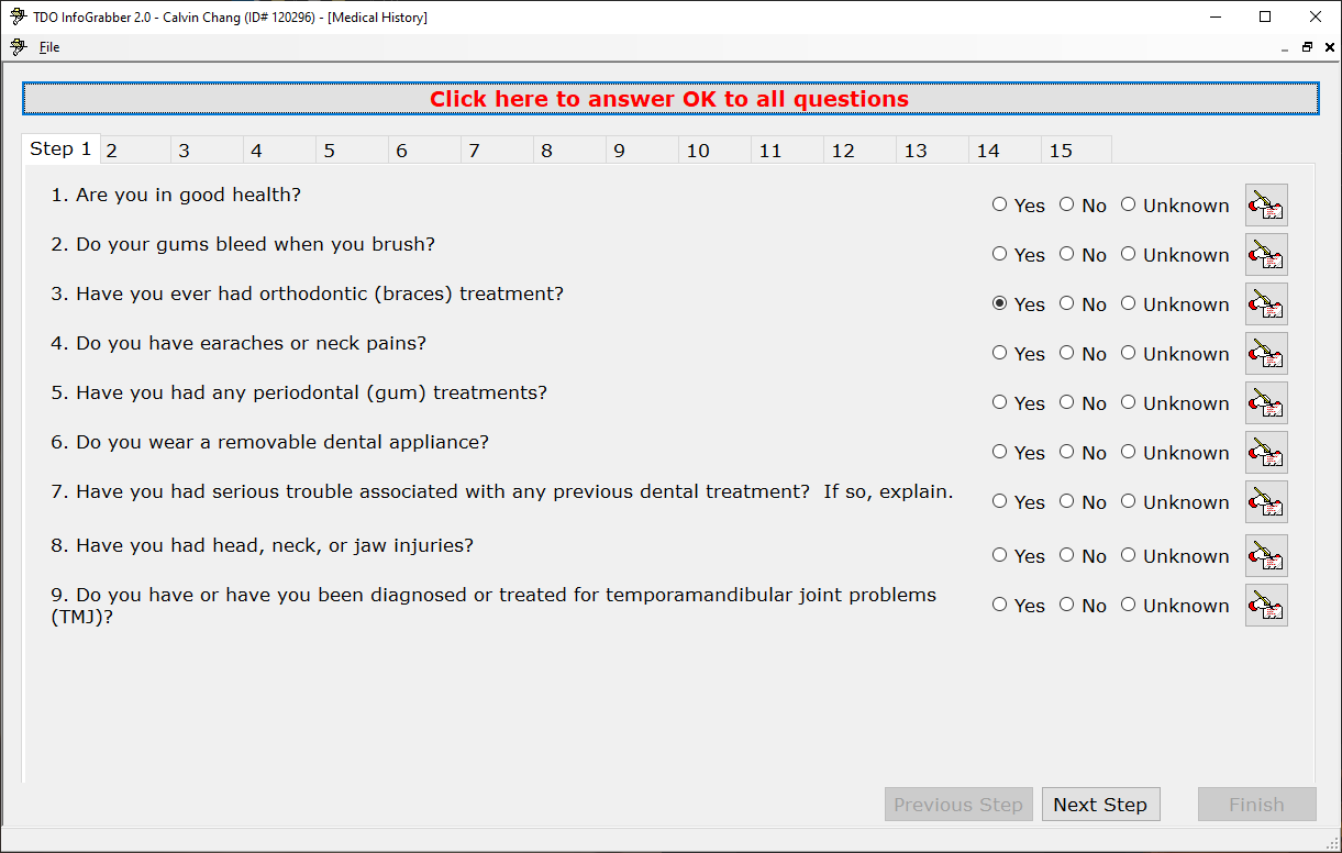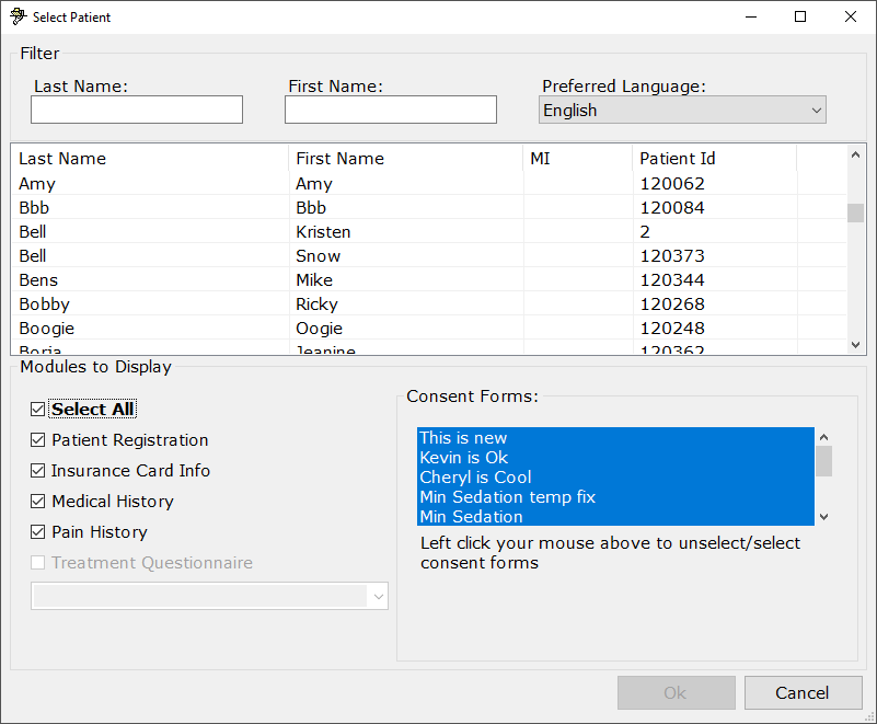 After that, a list of patients comes up, just select the patient you want to register. Select which modules you want them to complete (ex. If they are coming back for a recall, you may just want the medical history updated, so uncheck the other modules). Then select the Consent Forms you want them to sign.