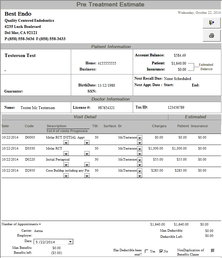 You can also print out the Pre Treatment Estimate for your patient by going to Front Desk Menu > Pre Treatment Estimate. Just make sure the fees have not been posted to the ledger yet for this work :