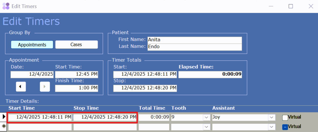 If you notice any patients with unusually long treatment times, you can edit those directly within the patient’s chart by navigating to Patient Tools - Edit Timers.