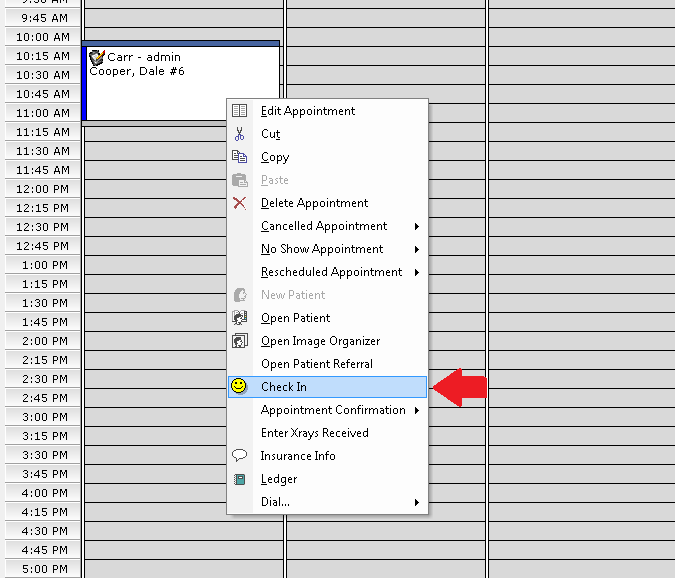 Check in Patient: Check in your patient by right clicking on the appointment on the Calendar and selecting Check In