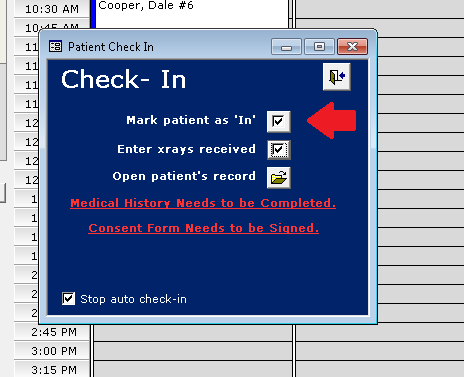 When the patient is brought to the operatory for treatment, the doctor or the assistant should then click the ‘start time’ for that patient.