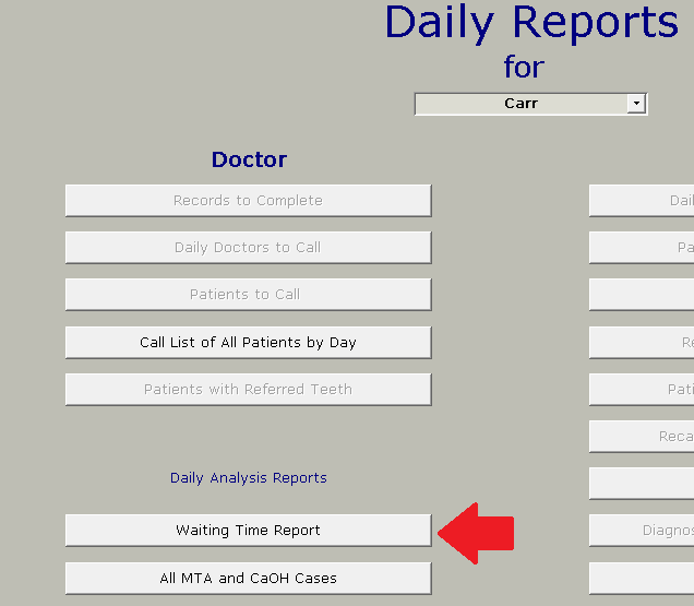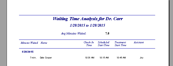 The waiting time report will summarize, by day, the patient check in time, the treatment start time and total waiting time.