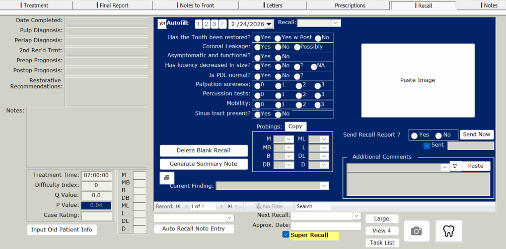 The patient can be categorized as a Super Recall by clicking the Super Recall checkbox from either the Final Report page or the patient's Recall page. Super Recall patients will also show up on the recall report.