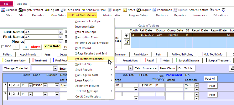 Estimated Reading Time: 1 MinutesTo print out a statement for a patient of fees entered, but not yet posted, go to Front Desk Menu and select Pre Treatment Estimate