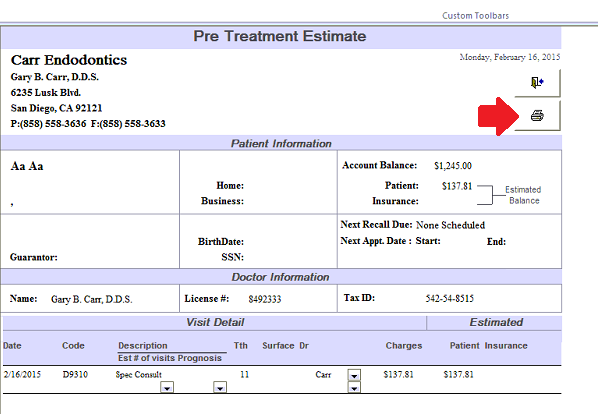 This is useful to print and give to the patient as it shows the proposed treatment as well as the portion the patient would be responsible for. Also includes the estimated number of visits, next appointment, and signature line where the patient can agree to the fees. Remember, this is just a general estimate, and many factors might change the amount the insurance pays. To open the print form, click the Print button.