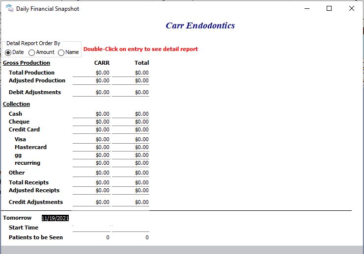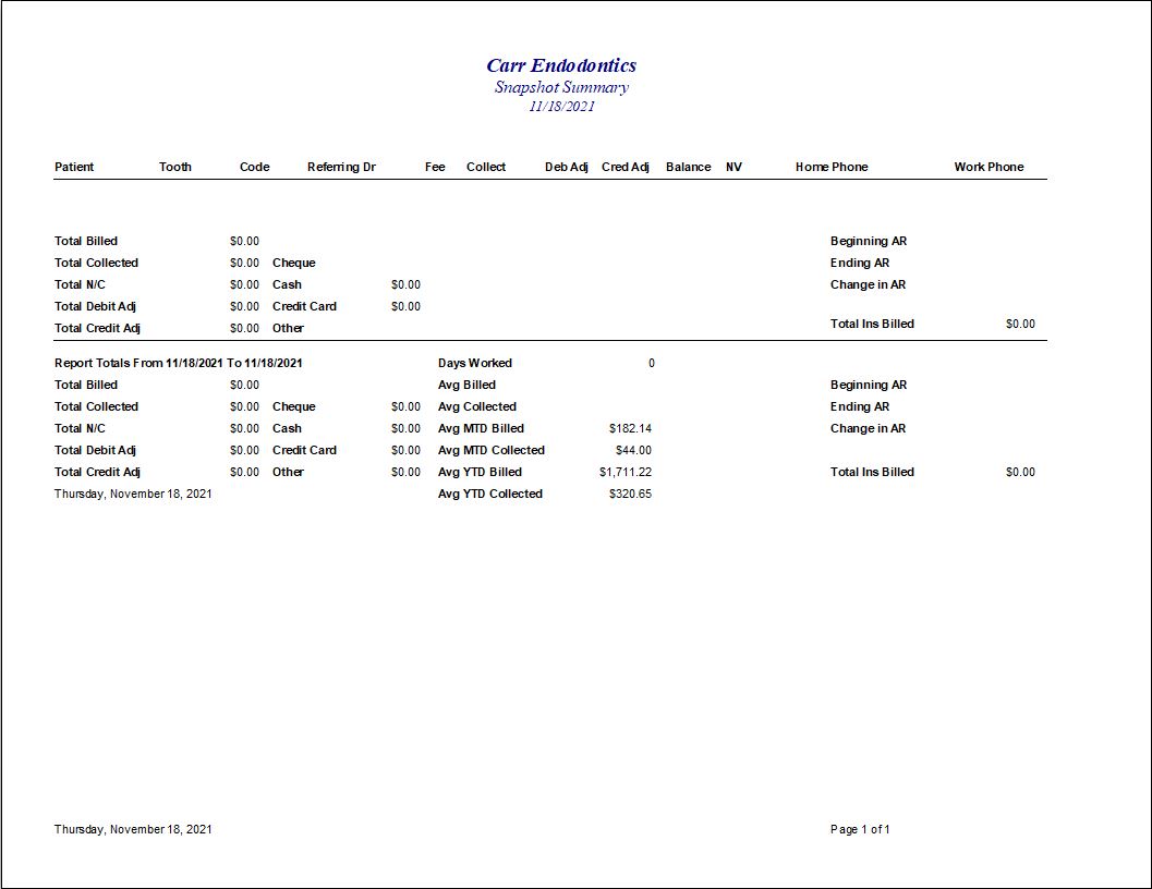 The Daily Snapshot is a smaller version of our regular Snapshot report. The Daily Snapshot just has your basic financial information for the current date including production and collections.