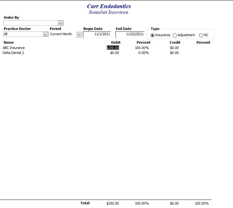 Insurance - You will see the dollar amounts and percentages billed and collected for each insurance company for that time period. It is really valuable to see how much you are billing to each company and then also the percentage of collections. For example, you might see you are billing 80% of all insurance to Delta but only collecting 40% of insurance collections.