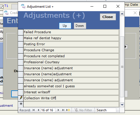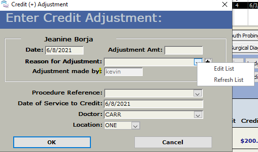 On the ledger, click on 'Credit Adjustment'. Right click on the drop down arrow for 'Reason for Adjustment' > edit list.