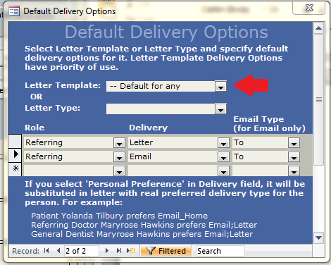 Then, from the top combo box labeled ‘Letter Template’ select any individual template that would not go to your default options. For instance if a specific letter template will always be sent to the patient, please adjust the delivery options for that letter otherwise it will default to be sent to whatever show in Default options.