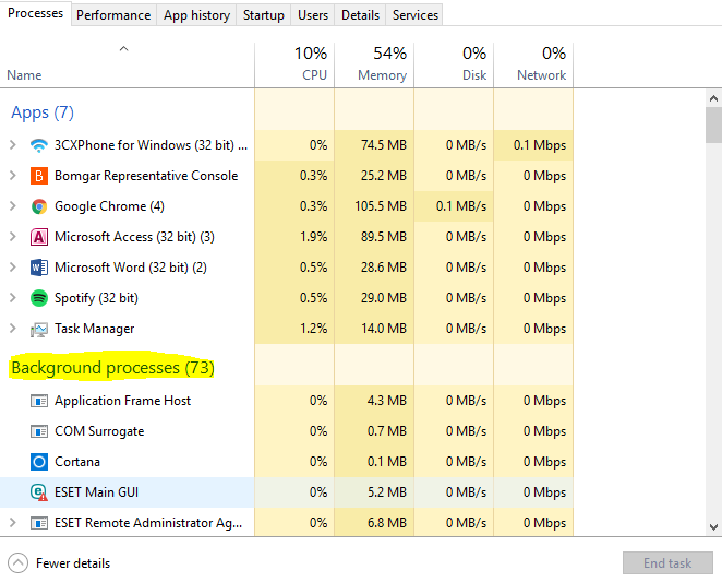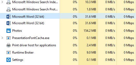 - For Windows 8 and newer machines, scroll through the Background Processes area until you see Microsoft Word (32 bit) there will be more than one running.