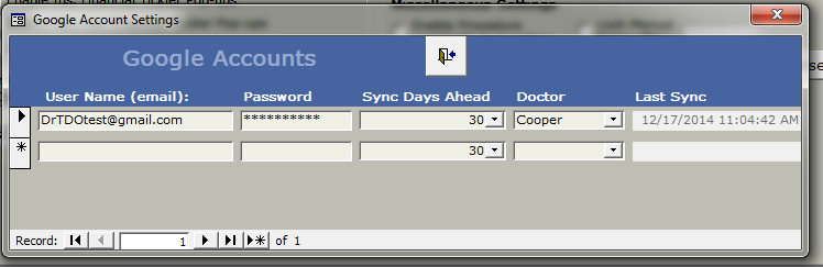 3. Enter in your existing Google email account and password. Select how many days ahead the system will synchronize the appointments. Keep in mind that this is Case Sensitive so ensure the e-mail account is listed exactly as it appears after logging in. Close the form and the Control Table.