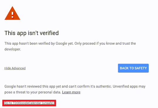 If prompted, click ’Advanced’ and then ’Go To TDOGoogleCalendar (unsafe)’ (Don’t worry, this application is safe, just hasn’t been verified by Google yet).