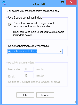If you check the ’Use Google default reminders’ box, every event synchronized to your Google Calendar will use your Google Calendar’s default event notification settings (so if you have many appointments, you’ll receive many notifications).