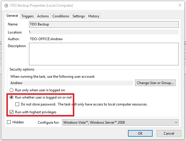 On the Properties screen, select Run whether user is logged on or not and Run with highest privileges.