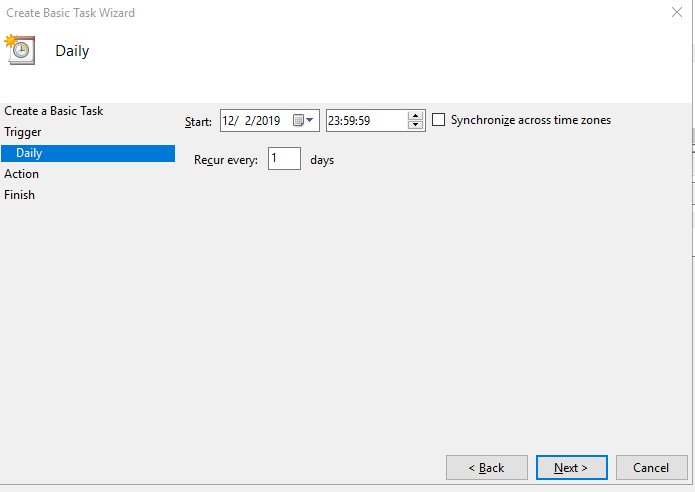 In the Task Trigger, make sure to set your backup to run Daily and then click Next.