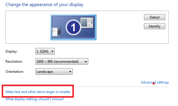 2. Choose Screen Resolution. When the Change the appearance of your display window comes up, select the Make text and other items larger or smaller