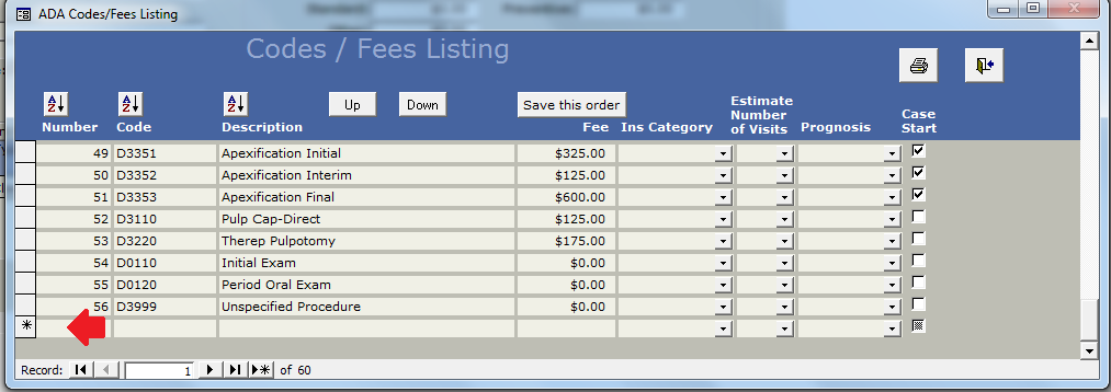Scroll to the bottom of the list, and add the new fee code to the blank line with the asterisk filling in all applicable fields.