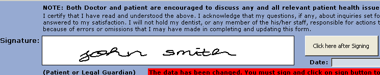 - When the Medical History form is open, the Topaz signature pad should be ready for the patient to sign. Have the patient sign the signature pad then have the patient click on the “OK” button on the signature pad. The user should see the patient’s signature on the form.