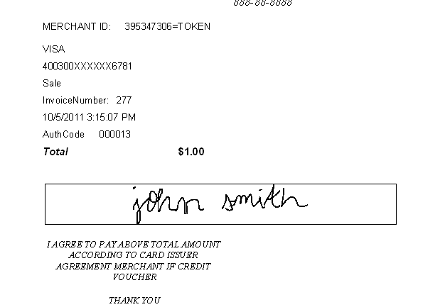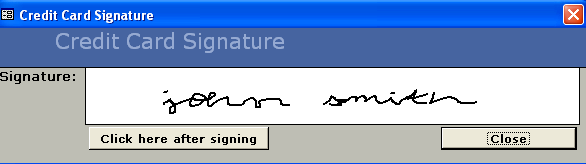 The patient will sign the Topaz signature pad and click on the OK button on the pad. The user will click on the “Click here after signing” button and the credit card receipt will display with the signature. There is no need for the office to print a hard copy of the receipt to keep for their records because the signature and the receipt will be kept in the database. The user can retrieve the receipt at any time.