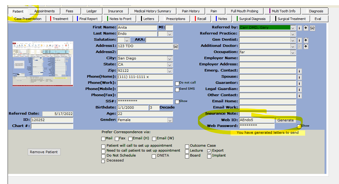 Go to the Letters Module >Template: “Patient Registration”; this will autofill the patient’s web username and password.