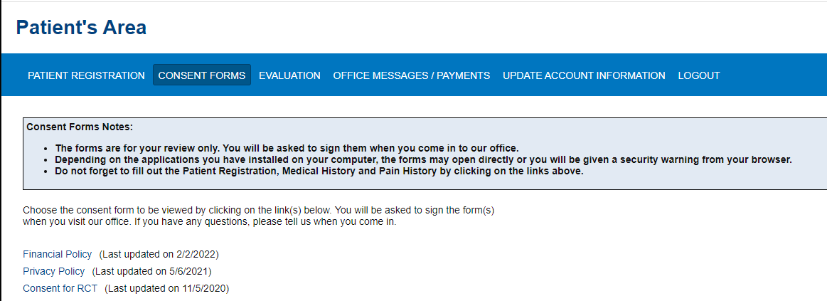 Consent Forms: The patient can review the consent forms before signing them in the office.