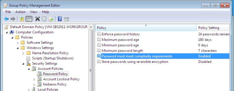 Double click “Password must meet complexity requirements” and change the value to Disabled and click OK: