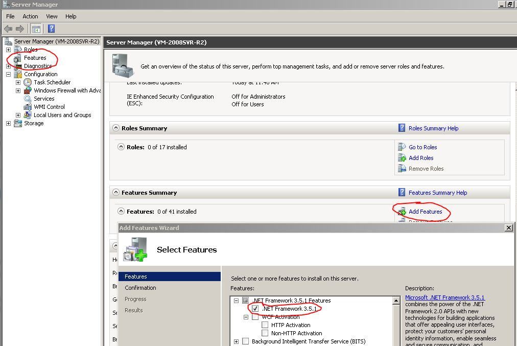 To install .NET Framework 3.5 on your server management screen, please enable the .Net 3.5.1 in your Server Role Management Tool:
