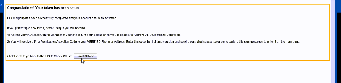 You will see a verification screen confirming the new token has been registered, and you may begin using it. Click “Finish/Close”.