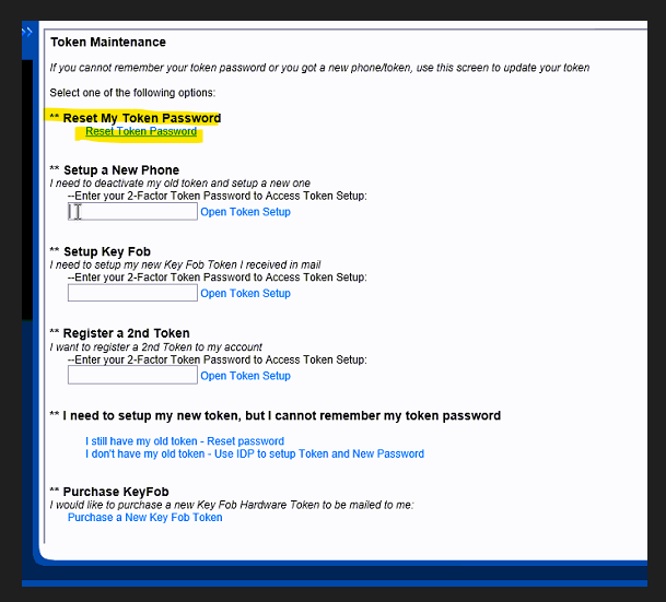 - The "Token Maintenance" window will open. Select the "Reset My Token Password" option.