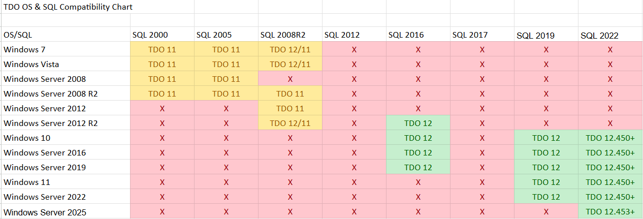For your Server, we recommend either Windows Server 2016 to Server 2022 (you need to be on at least version 12.416d for Server 2022). TDO 12 is not supported on Server 2008 or 2008 R2 or 2012 non R2. TDO Version 11 will not work on Server 2019.