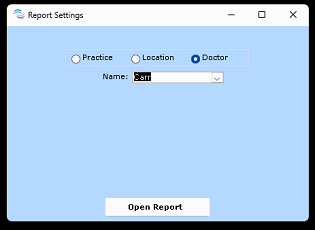 Required: Use the Name: drop-down to select the appropriate name of either the Practice, Location, or Doctor that you'd like to view