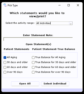 The Pick Type window allows you to define the activity range, add a note to all statements you are about to generate, and filter by patient status. Breaking down your accounts receivable by the age of the account; this can be useful in determining which patients need to be contacted regarding their balance.