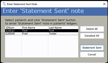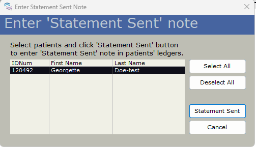 Optional: In the Enter Statement Sent Note click Select All to highlight all loaded patient statements or manually select them individually, once happy with your selections click Statement Sent. Any patient that was marked as Statement Sent will now have a new note in their Ledger saying so. If you would like to skip this step, simply click Cancel.
