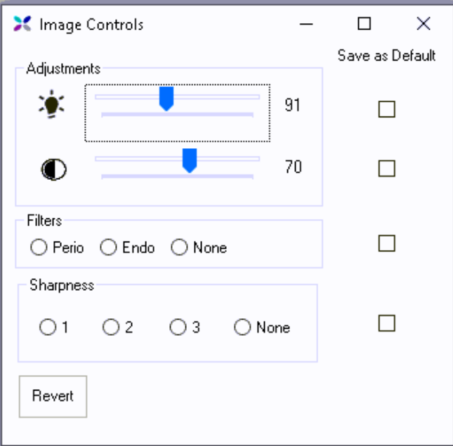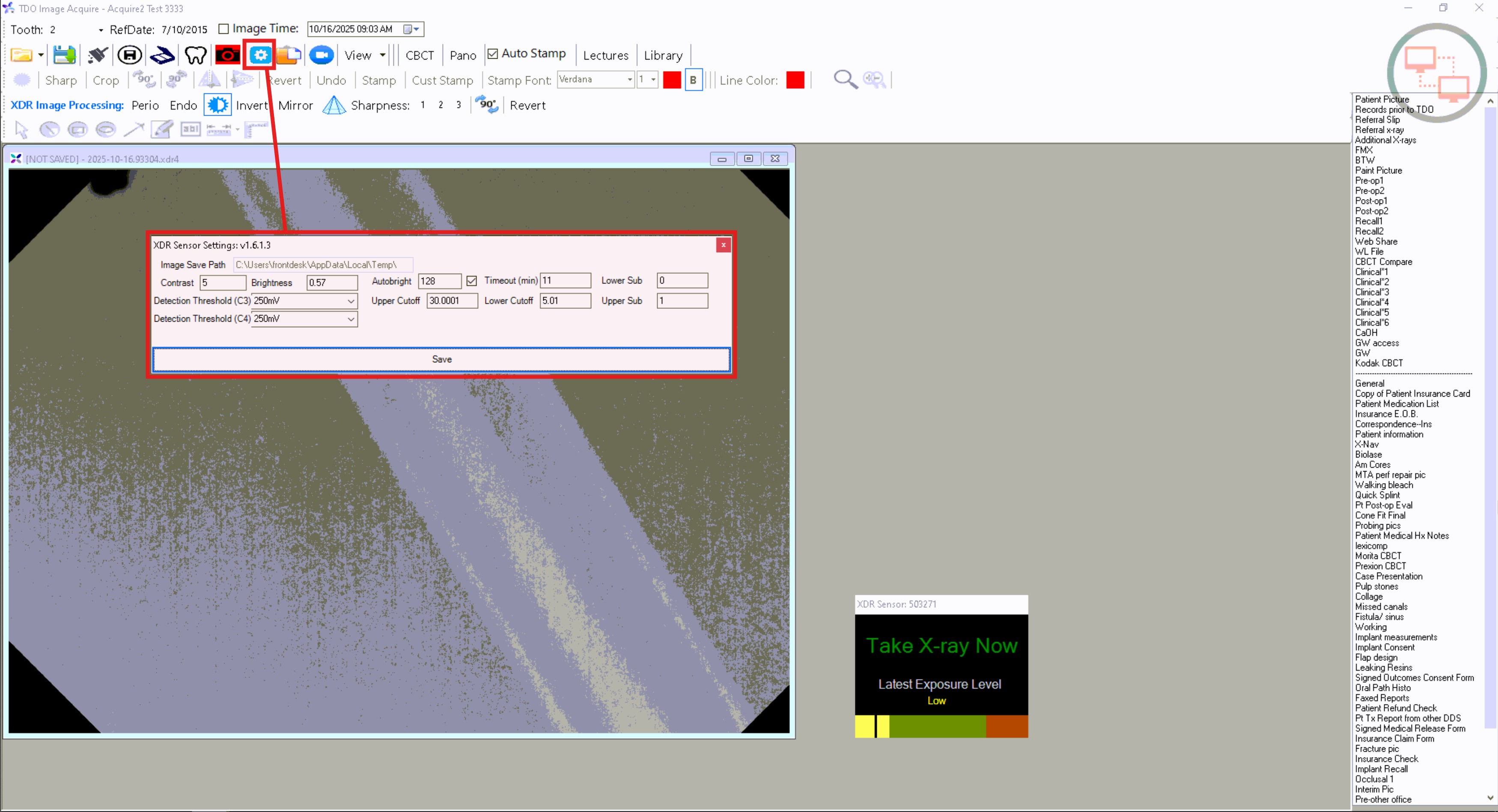It is recommended to NOT save your selection for the first two options (Brightness and Contrast), as XDR’s ‘Auto bright’ feature is designed to automatically adjust the brightness of each image at the time of capture. If the doctor would like to have the captured image to be brighter or dimmer, the proper place to adjust this setting is in the XDR Sensor Settings (see the screenshot below). If you have XDR configured as your Digital Radiography option in the Control Table, you will be able to see the “Configure XDR Sensor” button circled in red in the screenshot below. This is an XDR control and the user would need to contact XDR if they need help in adjusting these values.