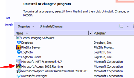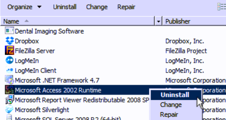 2. When in Programs and Features, scroll down till you get to the Microsoft Access 2002 Runtime program. Select it, then right click on it. Then select “Uninstall”. Follow instructions for uninstall.