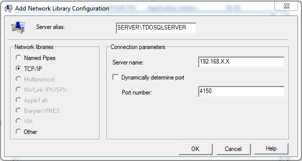 - Server alias should follow the format "(server name)\tdosqlserver"