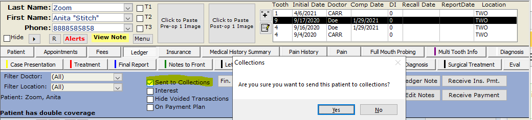 If the patient is being sent to collections you can select the collections option It will confirm the action and then add a ledger note the patient was "Sent to Collection"