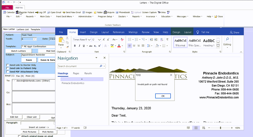This article will show you how to resolve the invalid path or path not found error and fix the inability to save and send from the letters module.