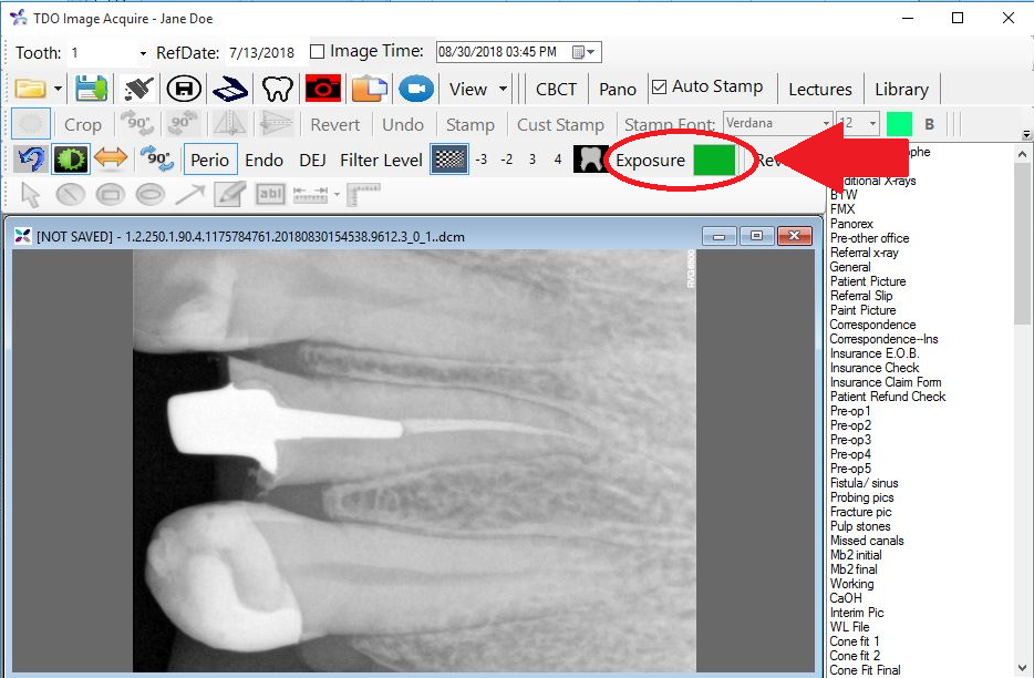 After taking an x-ray, the first thing to notice is the exposure bar circled below. Green would mean enough exposure time was used. Red would mean not enough exposure time was used. It is helpful in determining whether exposure settings need to be adjusted.