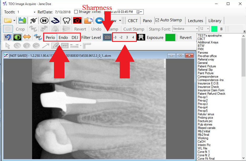 - Next, there are the Perio/Endo/DEJ filters. Find the appropriate filter that provides the best starting point for adjusting quality. Try each of the Filter Levels ans Sharpness filter as well.