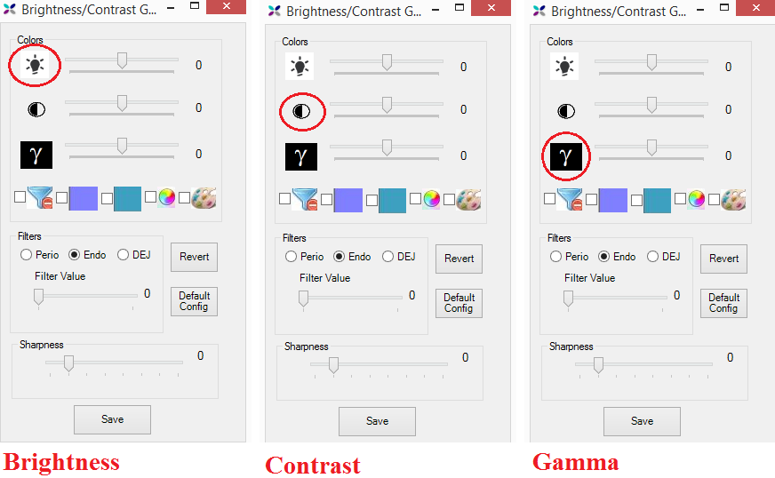 Typically the best filter to start with is the Gamma filter. If the office wants a darker image, click on the slider and move to the right asking the office to tell you when to stop. If the image should be lighter, slide to the left. When a suitable level has been found. Ask if the image needs more or less contrast, and then follow the same steps for the contrast slider. And then the brightness filter if necessary. Once you are happy with the image, click the Save button to save your own custom filters. Have a staff member write down the values listed just in case someone accidentally changes it. The next time an x-ray is taken, it will use the settings you have chosen.